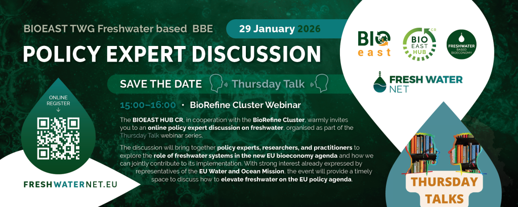 The BIOEAST HUB CR, in cooperation with the BioRefine Cluster, warmly invites you to an online policy expert discussion on freshwater, organised as part of the Thursday Talk webinar series.